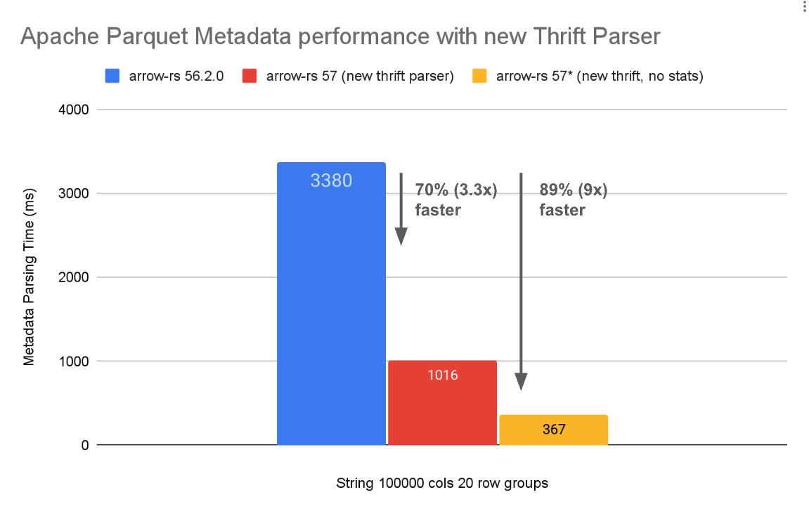 由于新的自定义 Apache Thrift 解析器,parquet Rust crate 的 57.0.0 版本解码元数据的速度比以前的版本快三倍以上。新的解析器在所有情况下都更快,并且能够实现生成解析器无法实现的其他性能改进,例如跳过不必要的字段和选择性解析。